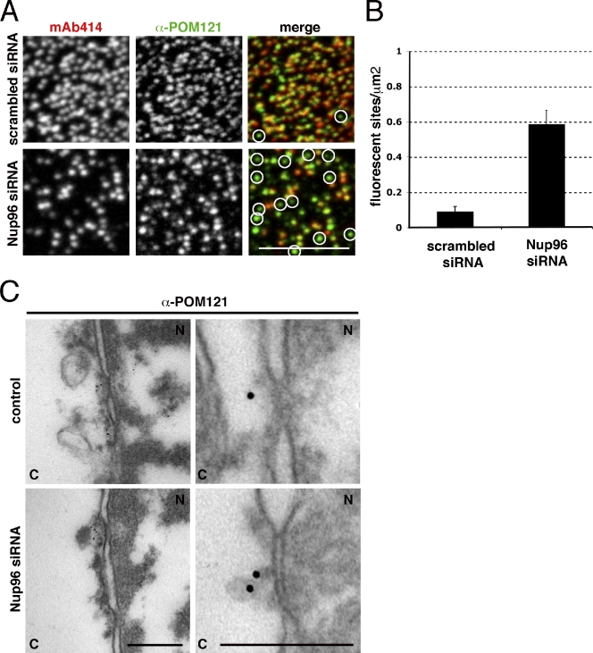 Figure 2. POM121 is present at early NPC assembly intermediates. (A) Double immunofluorescence staining of the nuclear surface with mAb414 and α-POM121 antibodies in U2OS cells transfected with scrambled or Nup96-specific siRNA oligos. Circles indicate POM121 signal without mAb414. (B) Quantification of sites containing POM121 signal without mAb414 in control and Nup96-depleted U2OS cells. n = 8 nuclear surfaces per condition. Error bars are standard error. (C) TEM of immunogold labeling of POM121 in control and Nup96-depleted U2OS cells. Bars: (A) 2 µm; (C) 200 nm. N, nucleoplasm; C, cytoplasm.