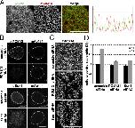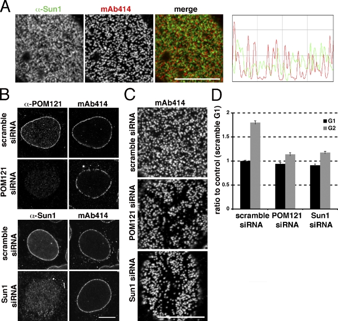 Figure 4. Sun1 is required for interphase NPC assembly. (A) Double immunofluorescence staining of the nuclear surface with mAb414 and α-Sun1 antibodies in U2OS cells. Histogram of fluorescent signals shows partial overlap between mAb414 and α-Sun1 staining. (B) Immunofluorescence staining of U2OS cells shows efficient knockdown of POM121 and Sun1 by siRNA oligo transfection. (C) Immunofluorescence staining of the nuclear surface using mAb414 in U2OS cells transfected with either scrambled or siRNA oligos specific to POM121 or Sun1. (D) Quantification of total mAb414 fluorescence during G1 and G2 in U2OS cells treated with either scrambled or siRNA oligos specific to POM121 or Sun1. n > 167 nuclei per condition. Error bars are standard error. Bars, 10 µm.