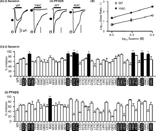 FIGURE 4. Antagonist action at P2X1 receptor mutants E52C to G96C. An EC90 concentration of ATP was applied to oocytes expressing P2X1 WT and P2X1 receptor mutants E52C to G96C. Antagonists were applied to the P2X1 receptor using concentrations that inhibited the WT response by ∼50%, suramin (3 μm) and PPADS (1 μm). A, representative recordings of Y90C (i), a P2X1 mutant with increased suramin sensitivity, and I62C, a P2X1 mutant with increased PPADS sensitivity (ii). Traces show the response in the presence of ATP only (open circle) and in the presence of ATP and the antagonist (closed circle). ATP was applied for 3 s (black bar), and the antagonists were bath-perfused 5 min before recording. B, Schild plot analysis of suramin antagonism at the WT P2X1 receptor and the mutant Y90C. C, percentage inhibition of EC90 concentration of ATP in the presence of the antagonists suramin (3 μm) (i) and PPADS (1 μm) (ii) on P2X1 receptor mutants E52C to G96C (n = 3–4). *, p < 0.05; **, p < 0.01. Error bars, S.E. Conserved residues are highlighted in black. |