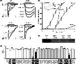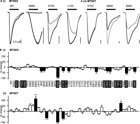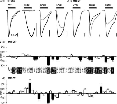 FIGURE 5. Effect of MTS reagents at P2X1 receptor mutants E52C to G96C. A, effect of MTSES (i) and MTSET (ii) on an EC50 concentration of ATP at the P2X1 receptor mutants E52C to G96C. The black lines represent the control response, and the gray lines represent the response in the presence of the MTS reagents (1 mm). B, the response of mutants E52C to G96C to an EC50 concentration of ATP in the presence of MTSES (i) and MTSET (ii). *, p < 0.05; **, p < 0.01; ***, p < 0.001. Error bars, S.E. Conserved residues are highlighted in black. |