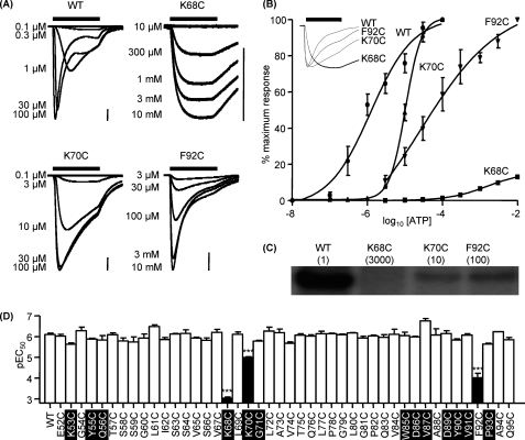 FIGURE 1. Effect of point cysteine mutations on ATP potency. Agonist action was tested on P2X1 WT and P2X1 receptor mutants expressed in oocytes by two-electrode voltage clamp (holding potential, −60 mV). A, concentration responses to ATP for oocytes expressing WT, K68C, K70C, and F92C mutant P2X1 receptors. ATP was applied for 3 s (indicated by the black bar; scale bar, 1 μA for all). B, summary of concentration response data for WT and mutants K68C, K70C, and F92C, which showed a significant decrease in ATP potency (n = 3–4). Error bars, S.E. The inset represents the slower response times of K68C, K70C, and F92C compared with WT in response to a maximum concentration of ATP. C, autoradiograph depicting radiolabeled [32P]2-azido-ATP cross-linked to WT and mutant receptors (mean EC50 for ATP (in μm) is shown in parentheses). D, summary showing pEC50 values of all mutants compared with WT (left). Values are shown as means ± S.E. Significant differences from the wild type are indicated (***, p < 0.001). Conserved residues are highlighted in black. |