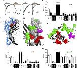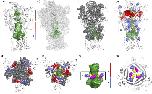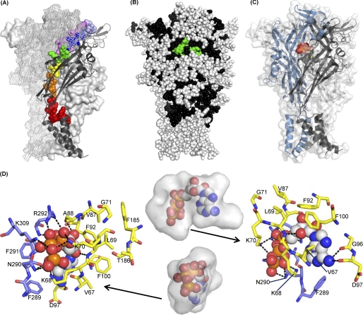 FIGURE 2. Homology model and ATP docking for the P2X1 trimer. Images were generated in PyMOL. A, overview of the P2X1 homology model, highlighting residues 52–96. Residues studied by cysteine-scanning mutagenesis are displayed as spheres in rainbow colors (red, Glu52–Ser59; orange, Gly60–Ser64; yellow, Val65–Val67; green, Lys68–Lys70; blue, Gly71–Thr75; indigo, Gln76–Leu80; violet, Gly81–Gly96) for the P2X1 subunit in the front of the picture. The overall structure of this subunit is shown in a black schematic representation, whereas the two P2X1 subunits in the background are shown in a surface and grid representation, respectively. B, mapping of mutation data onto the P2X1 homology model. All residues are shown as spheres. Residues colored black have been tested for their contributions to ATP sensitivity. Of these, residues that make substantial contributions to ATP sensitivity are highlighted in green (Lys68, Lys70, Phe92, Thr186, Asn290, Phe291, and Arg292). Residues not tested are shown in white. To give a more complete picture, previously published data for residues Glu181–Val200 and Ser286–Ile329 have been included in addition to residues Glu52–Gly96. C, overview of the P2X1 model showing the ATP binding site and the predicted ATP binding pose. The three subunits of P2X1 (residues 33–352) are shown in schematic representations in blue, black, and gray, respectively. One docked ATP molecule located at the interface between two subunits is displayed as spheres in CPK colors. The overall shape of the P2X1 model is indicated by the semitransparent surface for all three subunits. D, zoom into the ATP-binding site from the front (left) and rear (right). The best scoring docked pose of ATP is shown as spheres. Residues within 3 Å of ATP are shown as sticks, the blue and yellow colors indicating different subunits of the P2X1 trimer. Predicted hydrogen bonds are plotted as dotted lines in black. The middle panel illustrates the available space in the ATP binding cavity as determined by a hollow for both views. The volume of the cavity is shown as a transparent surface representation with the docked ATP in spheres. |