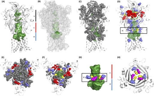 FIGURE 7. Internal vestibules and mapping of MTS reagent data onto the P2X1 receptor homology model. A and B, overview of the P2X1 model in a schematic representation (A) and mesh representation (B). The space of the internal vestibules is shown in a green surface representation; black, red, and blue bars indicate the upper vestibule (u), central vestibule (c), and extracellular vestibule (e), respectively. C and D, mapping the effects of MTS reagents on cysteine mutants onto the P2X1 receptor model. All residues tested are shown as spheres and are colored according to the effect of the MTS reagents. Black, residues where MTS reagents had no effect on current amplitude; blue, residues where the amplitude of responses but not sensitivity to ATP was affected; red, residues where cysteine mutants reduced ATP potency and MTS reagents modified the current amplitude and had a further effect on potency; yellow, residues where cysteine mutation had no effect on ATP potency but MTS reagents modified the amplitude of responses and ATP sensitivity. The vestibules are shown in mesh representation. Residues that were modified by MTS reagents with no effect on ATP potency (blue and yellow) are found predominantly around the central vestibule. E and F, MTS data from C and D viewed from the top. In F, residues capping the upper vestibule have been removed to better illustrate the residues aligning the upper vestibule. G, zoom into the narrow region between the central and extracellular vestibule. MTS-sensitive residues between the two vestibules are shown as spheres for G60C (yellow, cysteine-substituted residue shown), Phe195 (blue), and the adjacent positively charged Lys322 (magenta). H, cross-section looking “up” through the receptor from a slice as indicated in the boxes in D and G. Residues are shown as in G. |