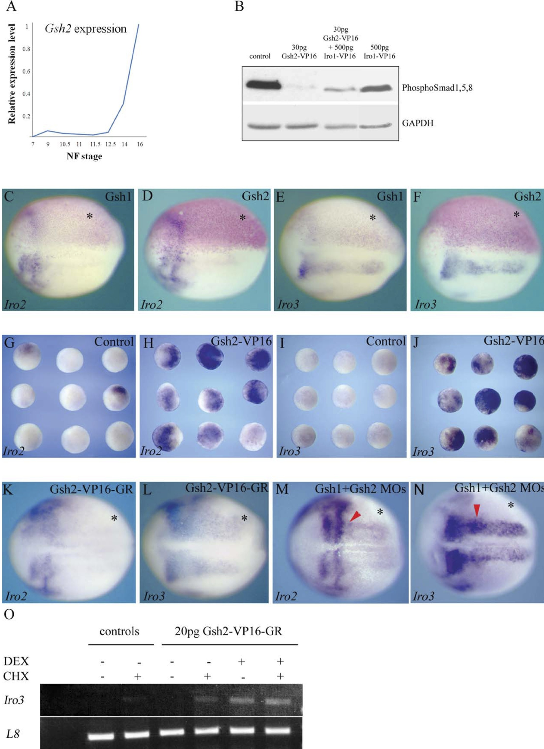Fig. 3. Repression of Iroquois gene expression by Gsx proteins. A: Quantitative-polymerase chain reaction(Q-PCR) analysis of Gsh2 expression during early development. Levels are normalized to ornithine decarboxylase (ODC) expression and are shown relative to expression at Nieuwkoop and Faber (NF) stage 16. B: Western blot analysis of stage 11 X. laevis embryos injected with mRNAs as indicated, and blotted with antibodies against PhosphoSmad1/5/8 and GAPDH (glyceraldehyde-3-phosphate dehydrogenase) as a loading control. C-F: In situ hybridization analysis of (C,D) Iro2 and (E,F) Iro3 expression in neurula stage 14 X. tropicalis embryos unilaterally injected with (C,E) 20 pg of Gsh1 mRNA and (D,F) 5 pg Gsh2,mRNA. Dorsal views, anterior to left, injected side at top and marked with asterisk). Injected region indicated by b-galactosidase co-injection and red-gal staining (pink). G-J: Expression of (G,H) Iro2 and (I,J) Iro3 in animal cap explants from (G,I) control X. laevis embryos and (H,J) embryos injected with 40 pg Gsh2-VP16 mRNA. K-N: In situ hybridization analysis of (K,M) Iro2 and (L,N) Iro3 expression in neurula stage 14 X. tropicalis embryos unilaterally injected with (K,L) 15pg Gsh2-VP16-GR mRNA with dexamethasone treatment with stage 11or (M,N) Gsh2- and Gsh1-antisense morpholinos. O: Reverse transcriptase-PCR (RT-PCR) analysis of expression of Iro3 in animal cap explants taken from uninjected X. laevis control embryos or embryos injected with 20 pg of Gsh2-VP16-GR, and treated with cycloheximide (CHX) and/or dexamethasone (DEX) as indicated.