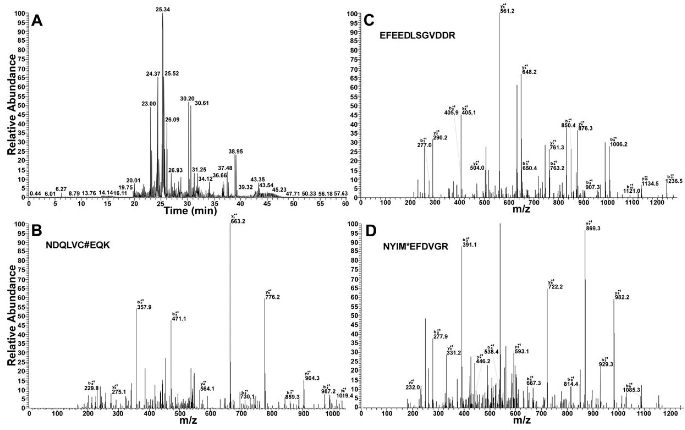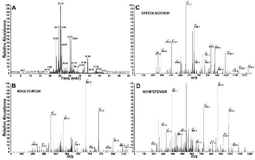 2.98; C# denotes carbamidomethyl-cysteine), EFEEDLSGVDDR (Xcorr 3.92), and NYIM*