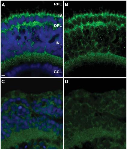 Figure 4 AâD: Localization of CRBP1 protein in the RPE and Mu¨ ller cells using immunohistochemistry.
