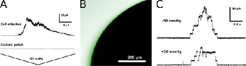 Figure 1. Suitability of Xenopus oocytes for the expression of bacterial mechanosensitive channel MscS. (A) Inactivation of endogenous mechanosensitive channels upon patch excision. Traces from the same water-injected oocyte are shown in cell-attached configuration (top) and excised-patch (bottom). Pipettes with BN 7 at a potential of +40 mV were used. (B) Confocal scan showing a portion of an oocyte expressing MscS-GFP 4 d after injection. Bright field and GFP signal (in green) are superimposed. (C) MscS activation by negative and positive pressure in the pipette, as recorded from the same excised patch in symmetric ND96 buffer. Pipette potential was +30 mV with BN 6.