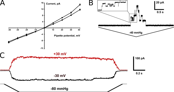 Figure 3. MscS exhibits low voltage dependence when expressed in oocytes. (A) The current–voltage relationship for MscS in symmetric ND96 (squares; n = 7 patches) and in TEA-Cl (diamonds; n = 4 patches). Error bars indicate standard deviation. (B) Example of conductive substates as recorded at +40-mV pipette potential. (C) Nearly symmetric activation curves recorded at opposite potentials in the same excised patch.
