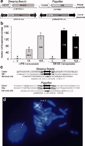 Figure 4. Transpositional activity of SB and PB transposon systems in Speedy cells. (a) Schematic representation of the mPB and SB100 transposon systems. The transposase-encoding plasmids (helper plasmids) expressing SB100 and mPB transposases are pCSB100XNpA and pCmPBNpA, respectively. The donor plasmids for SB100 and mPB transposon systems are pT2(SV40-neo) and pXLBacII(SV40-neo), respectively. (b) Transpositional activities of SB100 and mPB in Speedy cells. The transposition rate was calculated as the ratio between the numbers of resistant colonies obtained in the presence of transposase-expressing construct versus in the absence (N = 3 ± SEM). Various amount of helper plasmids, namely 1X and 10X representing 150 ng and 1.5 μg, respectively, were tested: (c) Sequence of integration sites of mPB and SB100 within Speedy gDNA. The TSDs specific to each transposon system (TA for SB100 and TTAA for mPB) are underlined. (d) Representative images of FISH experiments on PBcl6 cell line generated by mPB transposition. An interphase nucleus is represented on the left panel whereas a metaphasic spread is shown on the right panel. The white arrows show fluorescent signals.