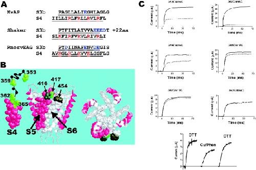 Figure 1. . Formation of disulphide bonds between residues in S4 and residues in the pore domain. (A) Sequences of the proposed voltage sensor paddle (Jiang et al., 2003a). α-Helical parts are underlined. S3b and S4 are packed to each other as suggested by Jiang et al. (2003a); that is, COOH terminus of S3b is to the right while COOH terminus of S4 is to the left. 22 residues of the Shaker S3-S4 linker are omitted. Positive charges in red and negative in blue. The net charge of the paddles: +3 (KvAP), +1 (Shaker), and 0 (RnorvEAG). (B) Molecular structure of S4 of KvAP (Jiang et al., 2003a) and the pore domain (S5-S6; side view to the left and top view to the right) of KcsA (Doyle et al., 1998). The residues used in the present investigation are labeled (Shaker numbering). The α-helical parts of S4, S5, and S6 in one subunit are space filled. The structure between 353 and 362 is not known for the Shaker K channel and is only drawn as a random coil. (C) Voltage-clamp data for six double-cysteine mutations. Current in response to a voltage step to 0 mV in control solution (1K), after incubation in 0.5 mM DTT (continuous line), and in control solution (1K), after >1 min exposure to Cu/phenanthroline (dotted line). Holding voltage was −80 mV. (Bottom) DTT (20 mM) reversed the Cu/phenanthroline effect, showing that Cu/phenanthroline induced disulfide bonds (shown for 359C/416C channels).