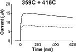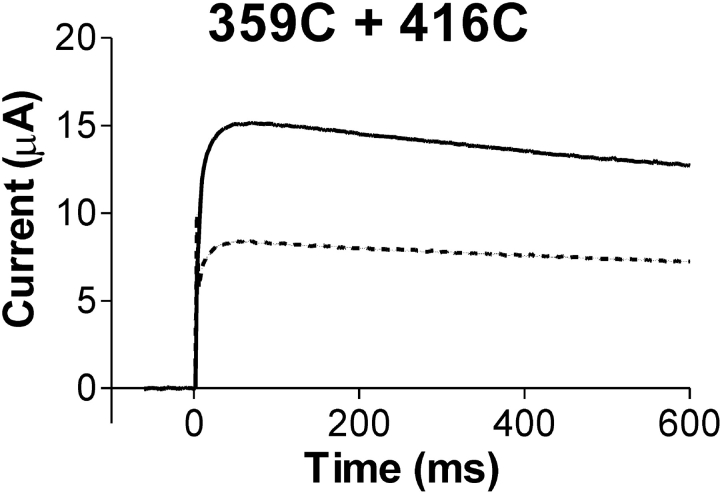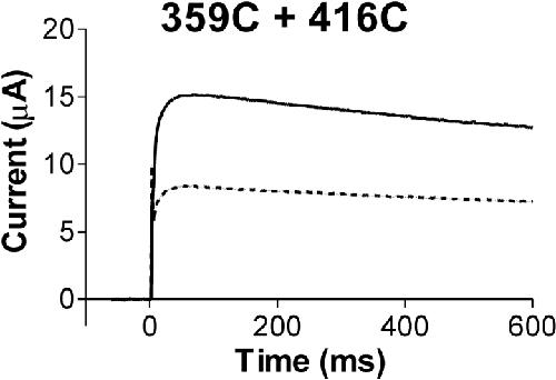 Figure 3. . Disulphide bond formation between two subunits. Equal amounts of 359C and 416C mutations were coinjected in the oocytes. Cu/phenantroline was applied for 60 s at 0 mV. Current in response to a voltage step to 0 mV before Cu/phenanthroline application (continuous line) and after a 60-s application of Cu/phenanthroline at 0 mV (dotted line). Holding voltage was −80 mV.