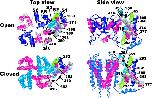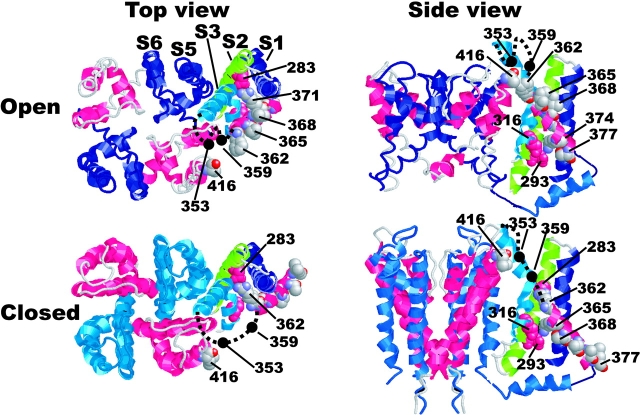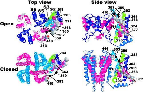 Figure 5. . Model for S4 movement in the Shaker K channel based on X-ray crystallographic structures of related channels and data from the Shaker K channel. To construct structural models of the different channel states, we used the KcsA structure (Doyle et al., 1998) for the closed configurations of the pore and the MTHK structure (Jiang et al., 2002) for the open configuration. To these pore structures we added modified versions of the isolated S1-S4 structure (Jiang et al., 2003a). S4 in KvAP differs from most other voltage-gated K channels in having unequal spacing of the positive charges. We therefore realigned the Shaker and KvAP sequences to preserve the electrostatic interactions in the crystal structure. We assumed that the residues in the crystal structure of KvAP (133 and 136) interacting with negative charges in S2 (62 and 72) and S3 (93) are homologous to 371 and 374 in the open state of Shaker. Thus, to model S1-S4 in the open state, we assumed that 124–139 in KvAP corresponds to 362–377 in the Shaker channel. The residue corresponding to 362 in the Shaker channel is close to the residue corresponding to 416 in the neighboring subunit. To model the closed state, we moved S4 downward in a helical-screw fashion, so that 362, 365, and possibly 368 interact with the negative charges in S2 and S3.