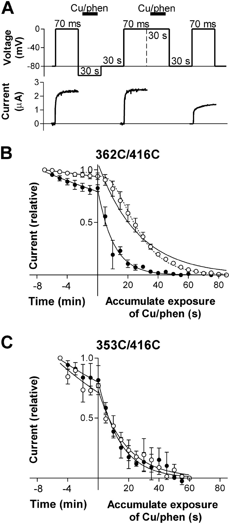 Figure 2. . Voltage and time dependence of disulphide bond formation. (A) State-dependent formation of disulphide bonds between 362C and 416C for three consecutive voltage steps to 0 mV. Voltage protocol is shown in the top panel. Cu/phenanthroline was added for 20 s, as indicated. Applied at −100 mV, Cu/phenanthroline did not affect the current; applied at 0 mV, Cu/phenanthroline clearly reduced the current. (B and C) Steady-state current at the end of a 70-ms pulse to 0 mV versus accumulated exposure to 2/100 μM Cu/phenanthroline. The voltage was stepped to −80 mV for 20 s, then to either −80 mV or to 0 mV for 30 s, followed by a voltage step to −80 mV for 10 s. For each episode, Cu/phenanthroline was applied for a brief period (usually 5 s) during the 30-s step either to −80 mV or to 0 mV. The data points at time < 0 were obtained in the absence of Cu/phenanthroline. n = 3–7 for all data points. Eq. 1 was fitted to the data points, with w = 1 for the continuous curves and w = 4 for the dashed curve. (B) Disulfide bond formation in 362C/416C at −80 mV (open circles) and 0 mV (closed circles). Spontaneous current reduction (time < 0): τ(−80) = 104 min and τ(0) = 33 min (w = 1). Cu/phenanthroline-induced current reduction (time > 0): τ(−80) = 27 s and τ(0) = 10 s (w = 1). τ(−80) = 14 s for w = 4. (C) 353C/416C. Spontaneous current reduction (time < 0): τ(−80) = 18 min and τ(0) = 24 min (w = 1). Cu/phenanthroline-induced current reduction: τ(−80) = 18 s and τ(0) = 15 s (w = 1).
