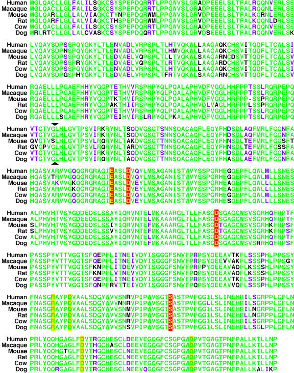 Figure 1. Sequence comparisons of mammalian CLN2-like enzymes.These sequences correspond to the complete enzymes, including the prosegment. Residues forming the active site are shown in yellow on red background, other conserved residues identified as important for the stability of the enzyme are marked with yellow background, residues identical in at least 5 of the structures are green, and residues similar in their character are shown in magenta. The maturation cleavage point generating the N terminus of the active enzyme is marked with black triangles.