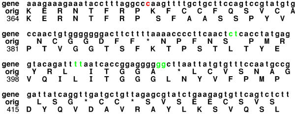 Figure 2. Corrected gene sequence of the zebrafish CLN2.This putative sequence shows the manual corrections that bring it into alignment with the sequence of the fugu enzyme. Inserted nucleotides are marked in green and a deleted one in red.