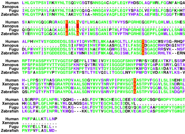 Figure 3. Sequences of the catalytic domains of CLN2. Complete sequences are shown for CLN2 from human, fugu, and zebrafish, together with the partial sequence of putative CLN2 in Xenopus tropicalis. Residues identical in all four enzymes are colored green and those similar are colored magenta. Active site residues are marked as in Figure 1.