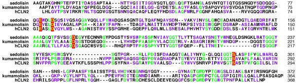 Figure 4. Sequence alignment of bacterial and mammalian enzymes. Alignment of the sequences of sedolisin, kumamolisin, and human CLN2 used in the construction of the model of the latter enzyme. The colors scheme is the same as in Figure 2.