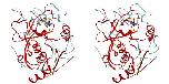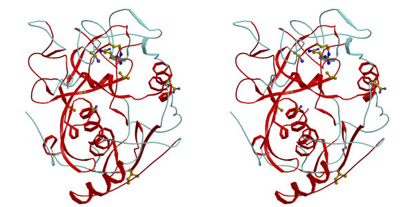 Figure 5. A homology-derived model of human CLN2. Ribbon diagram of the Cα trace of CLN2, with the segments that were modeled based on the highly conserved core of sedolisin and kumamolisin (r.m.s. deviation of 1 Å) colored in red. Side chains of the residues that were found to be mutated in the genes of families of patients with late-infantile neuronal ceroid lipofuscinosis [17] are marked in ball-and-stick.