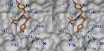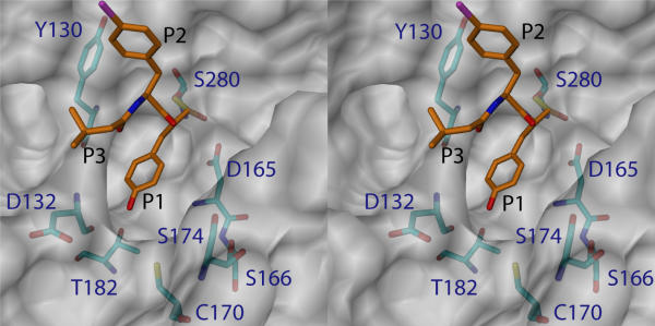 Figure 6. A model of the active site of human CLN2. The enzyme is shown in complex with pseudo-iodotyrostatin, a good inhibitor of the sedolisin family of peptidases. Only selected residues of the enzyme are explicitly shown on the background consisting of the molecular surface. The stick model of the inhibitor is colored gold and the P1-P3 residues are labeled in black. Similar views have been previously published for the experimentally-determined structures of sedolisin and kumamolisin [8]. The figure was prepared using the program DINO .