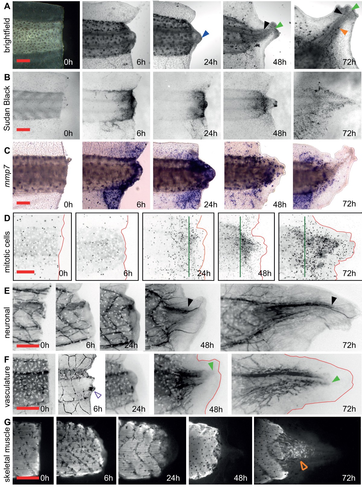 Figure 2. Characterization of the early, intermediate, and late phases of tail regeneration. (A) Tadpole tails imaged using bright field microscopy at early (0 h, 6 h); intermediate (24 h) and late phases (48 h and 72 h) of tail regeneration. Black open arrowhead shows typical dorsal constriction at 6 h post amputation; blue arrowhead shows pre-regenerative tissue; red arrowhead shows nascent finepidermis at the distal tip; black arrowhead = spinal cord; green arrowhead = notochord, orange arrowhead = melanophrore. (B) Tadpole tails stained with Sudan Black B (inflammatory cells). (C) Tadpole tails stained by whole-mount in situ hybridization for mmp7 (inflammatory cells). (D) Tadpole tails stained by immunohistochemistry for mitotic cells (pH3, shown in black). The tail in each panel is outlined in red and the plane of amputation is shown in green. (E) Tadpole tails stained to reveal the neuronal tissue by immunohistochemistry (acetylated tubulin, shown in black). (F) Tadpole tails stained by immunohistochemistry for vascular tissue (GFP antibody in mTie-2::eGFP transgenic line, shown in black). The open purple arrowhead shows a typical eGFP positive "clot" at the injured dorsal aorta. Green arrowheads show distally projecting blood vessels. (G) Tadpole tails stained by immunohistochemistry for muscletissue (12/101). The open orange arrowhead shows the presence of skeletal muscle in the regenerated portion of the tail. Red scale bar for each row is 250 μm. Note that the images in panels D-F are black and white reversals (i.e. shown as negative images).