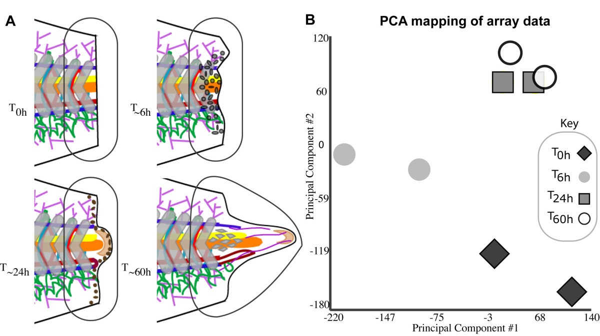 Figure 3. Array analysis of X. tropicalis tail regeneration. (A) The schematic diagrams of the early, intermediate, and late stages of tail regeneration. The circled areas depict the portion of tissue, and hence the RNA, collected and used for array analysis. (B) Shows the similarities of the eight arrays (four array time points in duplicate) using principal component analysis (PCA) mapping.