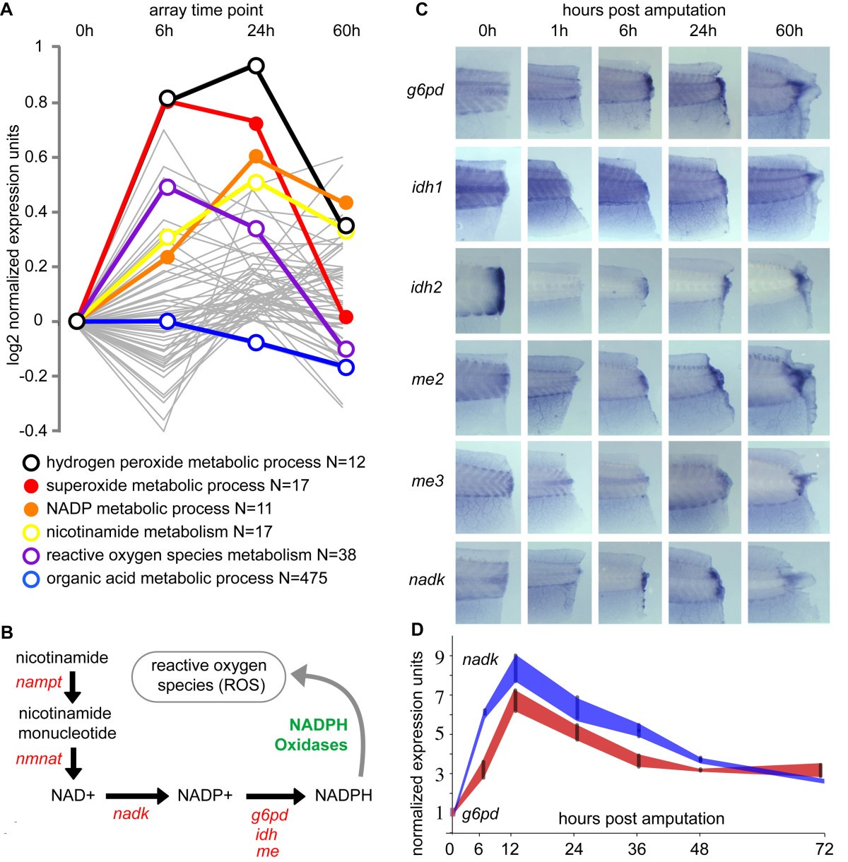 Figure 5. Systematic analysis of intracellular metabolic processes using gene ontology. (A) 66 metabolic processes are upregulated in the T24h array (gray). Five of ten highest upregulated processes in the T24h array are colored. The key to this graphic is shown below and "N" indicates the number of genes in the array corresponding to each process. "Organic acid metabolism", which was identified in an initial GO analysis (Figure 4D) is also plotted on the graph. (B) Nicotinamide, NADP, and the generation of reactive oxygen species (ROS) are connected by the metabolic pathway shown in (B) (genes regulating the pathway shown in red, proteins in green). (C) Shows the in situ hybridization patterns of g6pd, idh1, idh2, me2, me3, and nadk following tail regeneration (0 h, 1 h, 6 h, 24 h, and 60 h). (D) RT-qPCR expression profile of nadk (blue) and g6pd (red) following tail amputation. Error bars represent standard error of mean (SEM), lines connecting each error bar are meant to serve as a visual aide.