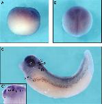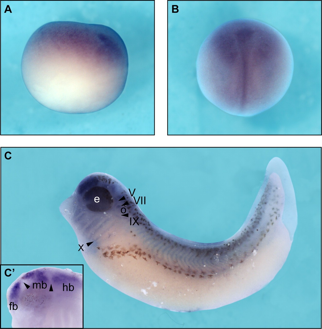 FIGURE 3. Expression pattern of xAmer2 in Xenopus embryos by whole-mount in situ hybridization. A, xAmer2 expression in Xenopus embryos at NF stage 10.5 in the animal hemisphere (lateral view, animal pole to the top). B, xAmer2 expression in the anterior neural plate at NF stage 16 (dorsal view, anterior to the top). C, xAmer2 expression in the central nervous system, otic vesicle (o), eye (e), and cranial ganglia and nerves (arrowheads; V, trigeminal; VII, facial; IX, glossopharyngeal; X, vagal) at NF stage 35 (lateral view, anterior to the left). Câ², cross-section through the head region of an NF stage 35 embryo (anterior to the left). xAmer2 expression was clearly seen in the forebrain (fb), midbrain (mb), and hindbrain (hb) but not the boundaries between these domains (arrowheads).