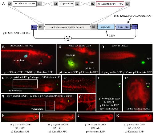 Fig. 2. Incorporation of Xenopus-compatible elements into pTransgenesis. (A) Schematic of recombination with a Xenopus-compatible p4 vector containing a single I-SceI site, Tol2 elements, and SAR-CH4 sequences, p3 Katushka RFP and Xenopus-compatible p1 and p2 constructions. (B-K) Transgenic tadpoles from the resulting recombinations are shown. Individual p1, p2, p3 constructions and expression domains are written on each panel in white. Images in Eâ² and Gâ² are magnified images of the boxed regions in E and G, respectively. Image in Fâ² shows the induction of RFP from the heat-shocked tadpole in F.