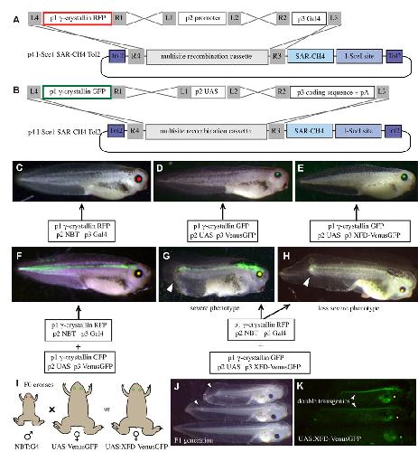 Fig. S3. Establishment of X. laevis transgenic lines amenable to Gal4-UAS binary transgene expression. (A,B) Schematics showing the construction of Gal4 and UAS constructs using pTransgenesis plasmids. (C-E) Merged brightfield and fluorescent exposures of single transgenic embryos containing the indicated Gal4 or UAS drivers. (F-H) Merged brightfield and fluorescent exposures of double transgenics. The arrowheads in G and H show a morphological defect in the tail in severe and less severe phenotypes. (I) Schematic of F0 founder crossings. (J) Brightfield images showing resulting F1 transgenic tadpoles, with double transgenics showing germline transmission of tail and body length defect. (K) Merged fluorescence of GFP and RFP channels for the tadpoles shown in I.