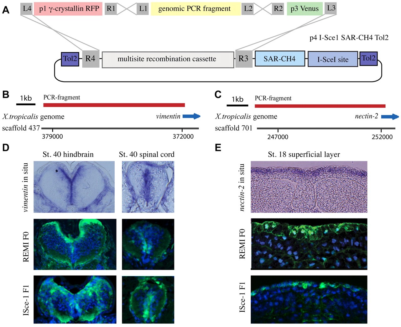 Fig. 3. A highly efficient method of testing promoters and creating transgenic lines using pTransgenesis. (A) Genomic PCR fragments are cloned directly into the p2 position, thus allowing the recombination shown. (B,C) PCR products encoding regions 5â² to nectin-2 and vimentin were generated and tested for transcriptional activity in F0 X. laevis and in F1 X. tropicalis. (D) Transverse sections through the hindbrain and spinal cord of embryos (dorsal side up) stained for endogenous vimentin expression (upper panels), or Venus transgene expression (green) in F0 transgenic X. laevis (middle panels) and F1 transgenic X. tropicalis (lower panels). (E) Transverse sections through the neural plate of stage 18 embryos (dorsal side up) stained for endogenous nectin-2 expression (upper panel), or Venus transgene expression (green) in F0 transgenic X. laevis (middle panel) and F1 transgenic X. tropicalis (lower panel). Nuclei are stained with DAPI (blue) in middle and lower panels in D and E.