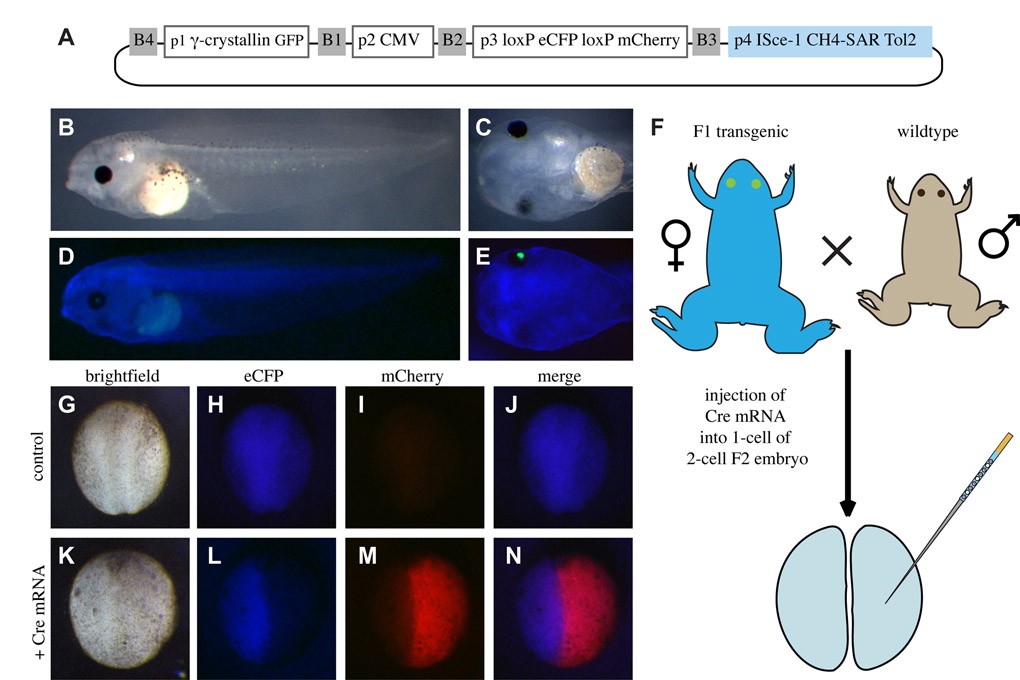Fig. S4. Establishment of an X. tropicalis transgenic line amenable to Cre-loxP fate mapping. (A) Schematic of the pTransgenesis construct used to generate an X. tropicalis line via I-SceI transgenesis. (B-E) Brightfield (B,C) and fluorescence (D,E) imaging of the F1 generation. Note that GFP expression is visible in only one eye lens in D and E, as the other lens is hidden behind the pigmented epithelium of the other eye. (F) Schematic of experiment to determine induce Cre-mediated site-specific recombination, which places mCherry under the control of the CMV promoter, and thus the functionality of the loxP elements in p3. (G-N) Hemispheric expression of cre mRNA in F2 generation results in Cre-mediated expression of mCherry, and concomitant loss of eCFP expression in the progeny of the cell that was injected with cre mRNA at the one cell stage (K-N) compared with control uninjected embryos (G-J).