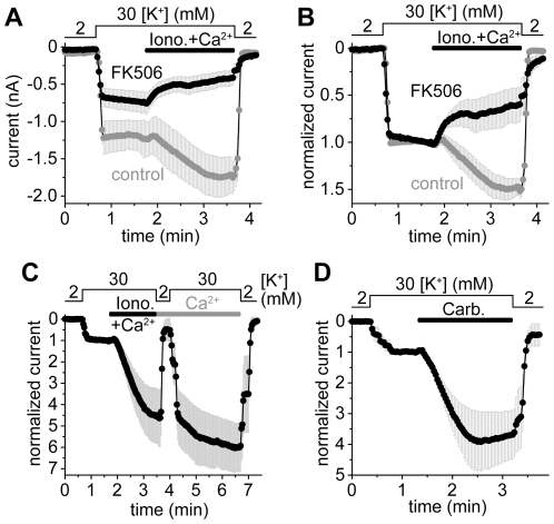 Figure 1. Calcineurin activates mouse TRESK several-fold in HEK293 cells.A. Calcium-dependent activation of TRESK current was measured at −100 mV in HEK293 cells after FK506 pretreatment (1 µM, 15–40 min, FK506, black curve) or without the application of the calcineurin inhibitor (control, gray curve). Whole-cell patch clamp recording was performed with calcium-free pipette and bath solutions containing 50 µM EGTA. Pipette solution contained GTP (0.1 mM) and ATP (1 mM). Extracellular [K+] was increased from 2 to 30 mM (as indicated above the graph) and the cells were subsequently challenged with ionomycin (1 µM) plus Ca2+ (2 mM, Iono.+Ca2+, horizontal black bar). B. Normalized responses to ionomycin plus calcium were calculated from the same recordings as represented in panel A. FK506 prevented the calcium-dependent activation of TRESK. C. TRESK currents during the stimulation with ionomycin plus calcium (Iono.+Ca2+, horizontal black bar) were measured with calcium-free pipette solution containing 50 µM EGTA but neither ATP nor GTP. Calcium (2 mM) was continuously present after the withdrawal of ionomycin (Ca2+, horizontal gray bar). Extracellular [K+] was repeatedly changed between 2 and 30 mM as indicated above the graph. The currents were normalized to the basal value measured before the stimulation. D. TRESK current was stimulated with carbachol (50 µM) via endogenous muscarinic receptors. The pipette and bath solutions were Ca2+-free, containing 50 µM EGTA and no ATP/GTP. Normalized curves were plotted; for average current data of panel C and D see Figure S3.