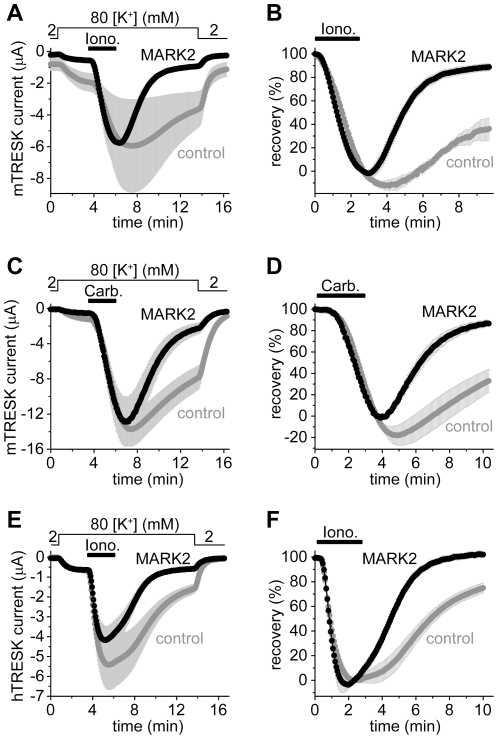 Figure 2. The coexpression of MARK2 with TRESK accelerates the return of the background K+ current to the resting state after the calcium-dependent activation.A. Background K+ currents of Xenopus oocytes coexpressing mouse wild type TRESK with MARK2 kinase (MARK2, black curve) or expressing only the channel (control, gray curve) were stimulated with ionomycin (Iono., 0.5 µM, horizontal black bar). Extracellular [K+] was changed from 2 to 80 mM and back as indicated above the graph. Note that the resting K+ current (the difference between the currents in 2 and 80 mM [K+] at the beginning of the measurement) was smaller in the cells coexpressing MARK2 with TRESK than in the control oocytes, whereas the average peak currents after stimulation in the two groups were identical in this experiment. B. The recovery of the currents of each oocyte (the same cells as in panel A) was calculated as a percent. The K+ current of the oocytes coexpressing MARK2 with TRESK almost completely returned to the resting value in contrast to that of the control cells expressing only the channel. C. A similar experiment as in panel A was performed with oocytes coexpressing mouse TRESK and M1 muscarinic receptor with MARK2 (MARK2, triple coexpression, black curve) or without the kinase (control, gray curve). The cells were stimulated with carbachol (1 µM, as indicated by the horizontal black bar). D. Recovery data were calculated from the recordings represented in panel C. MARK2 accelerated the return of K+ current to the resting value after receptor stimulation. E. The same experiment as in panel A was performed with human TRESK. (For further comments on these results see Figure S5.) F. Recovery data were calculated from the currents of panel E. The recovery of human TRESK current to the resting state was accelerated by MARK2 after the calcium-dependent activation.