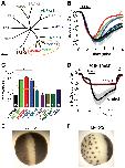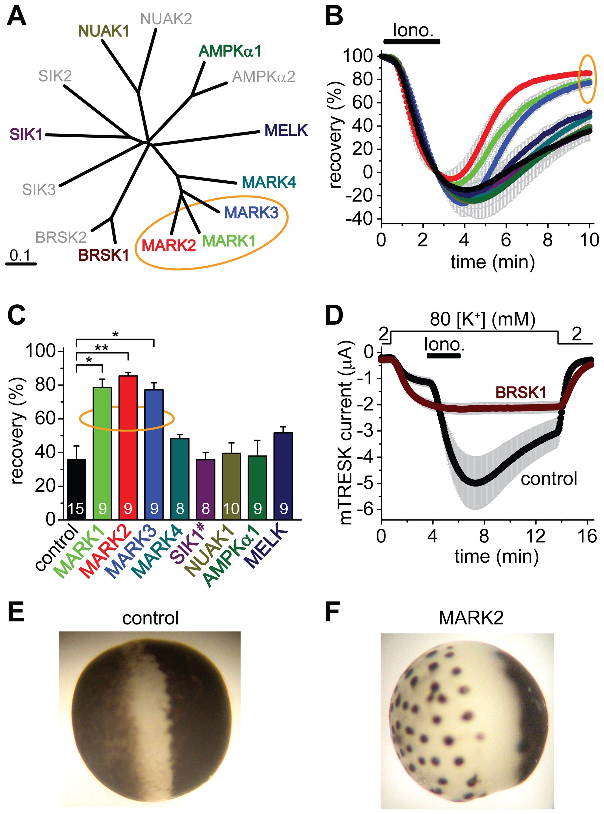 A. Multiple alignment and phylogenetic tree of mouse full-length AMPK-related kinases was created with Clustal W2 and TreeView. The enzymes, which have been cloned and functionally tested on TRESK, are shown in colors different from gray. The MARK kinases, which efficiently inhibit TRESK, are indicated with an orange ellipse. B. Time-dependent recovery of background K+ currents after the ionomycin stimulation (Iono., 0.5 �M, as indicated by the horizontal black bar) is shown for the groups of oocytes coexpressing the different AMPK-related kinases with mouse TRESK. Color code is the same as in panel A. Rapid recovery of K+ current in the MARK1, 2 and 3 groups is indicated with an orange ellipse. C. Average recoveries at the end of the measurement are shown for the different groups. The number in the columns indicates the sample size. SIK1 construct (SIK1#) contained amino acids 1�343, which included the kinase domain. The recovery in the MARK1, 2 and 3 groups was significantly different from that of the control cells (one-way ANOVA, followed by Tukey HSD test, *p<0.01, **p<0.001). D. Oocytes coexpressing BRSK1 and mouse TRESK (BRSK1, ferruginous curve, n = 16) or expressing only the channel (control, black curve, n = 15) were stimulated with ionomycin as in the case of the other AMPK-related kinases in panels A, B and C. Note that ionomycin did not activate TRESK current in the cells, which coexpressed BRSK1 with the channel. E. Representative photograph of a control oocyte expressing TRESK channels. Appearance is not different from a non-injected cell (not shown). F. Representative photograph of an oocyte coexpressing TRESK with MARK2 kinase. Note the reduced pigmentation on the animal pole, and the peculiar dark dots on the vegetative hemisphere following a more or less hexagonal arrangement.