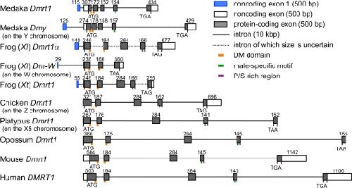 Fig. 1. Exonâintron structures of Dmrt1 orthologues and its paralogous sex-determining genes Dmy and Dm-W in vertebrates. The number shows the size (bp) of each exon. Noncoding exon 1 is shown as a blue box; other noncoding and coding regions in exons are shown as white and gray boxes, respectively. The locations of DM domains, male-specific motifs, and P/S (proline/serine)-rich regions are indicated by orange, green, and purple boxes, respectively. Medaka, Oryzias latipes; Frog (Xl), Xenopus laevis; Frog (Xt), Xenopus (Silurana) tropicalis; Chicken, Gallus gallus; Platypus, Ornithorhynchus anatinus; Opossum, Monodelphis domestica; Mouse, Mus musculus; Human, Homo sapiens