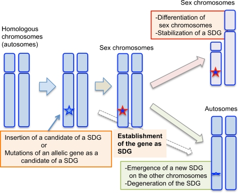 Fig. 5. Proposed model for evolutionary relationships between the appearance of sex-determining genes (SDGs) and sex chromosomes in vertebrates. First, a candidate SDG emerges or evolves on one chromosome of a pair of autosomes by insertion or mutation. Then, the candidate gene may be established as an SDG during species divergence with few morphological changes in the two chromosomes, in cases like that of the heterogametic XY or ZW sex chromosomes in the teleost fish medaka (O. latipes) carrying the Y-linked SDG Dmy, or the African clawed frog (X. laevis) carrying the W-linked SDG Dm-W, respectively. If the new SDG emerges as a stronger regulator for sex determination, the original SDG or its candidate might degenerate into a psuedogene, as in the case of sex determination in O. luzonensis, which is closely related to the medaka species. In contrast, if an SDG strongly contributes to the stability of a sex-determining system during species divergence, differentiation of the sex chromosomes might be allowed, leading to specialization of the heterogametic sex chromosomes and to stabilization of the SDG. This might be the case for the heterogametic XY sex chromosomes in eutherian mammals carrying the Y-linked SDG, Sry