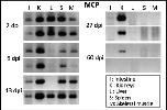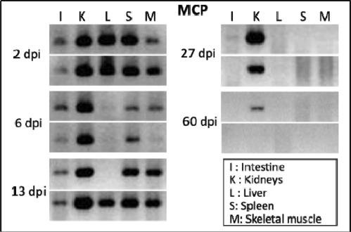 Figure 1. Slow clearance of FV3 DNA in X. tropicalis. FV3 DNA detected by PCR (35 cycles) using primers specific for the major capsid protein (MCP) on genomic DNA purified from various tissues of outbred X. tropicalis adults that were infected with FV3 by i.p. injection of 1 × 106 PFU for 2, 6, 13, 27 and 60 days (2 individuals per time point). |