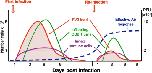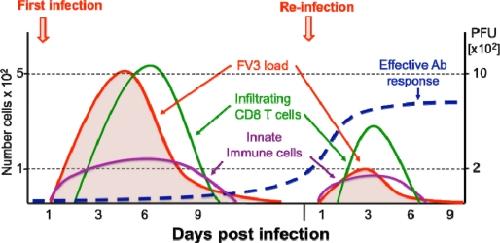 Figure 2. Schematic view of Xenopus adult immune response kinetics in infected kidneys. During both primary and secondary FV3 infections, MHC class II+ innate immune cell effectors (leukocytes) rapidly accumulate in the kidneys (violet line), the main site of infection, and pro-inflammatory genes (e.g., TNF-α, IL-1β) are induced. This is followed by an adaptive CD8 T cell response and infiltration (green line) that peak at 6 dpi during a primary infection. During a second FV3 infection, CD8 T cell response and infiltration peak 3 days earlier, which suggests T cell memory. However, the lower number of infiltrated CD8 T cells (5 time less) suggests that anti-FV3 antibodies (blue line) and B cell memory are playing a prominent role during secondary infection resulting in a faster viral clearance (red line). |