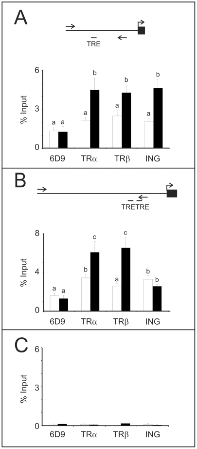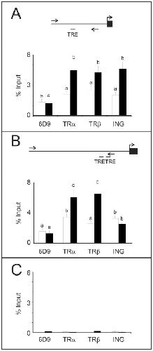 Figure 5. Chromatin immunoprecipitation assays indicate that ING protein associates with the TRβ and TH/bZIP promoters that are known to be T3-regulated in tadpole tails.The promoter regions amplified upon ChIP are indicated by the arrows in the cartoons above the graphs for A) TRβ and B) TH/bZIP promoters and C) a β-actin gene control. The graphs show the percent input values of the amplicons obtained after immunoprecipitation with the indicated antibodies directed against TRα, TRβ, ING, and a control antibody, 6D9. DNA-protein complexes were obtained from pools of 7â12 tails from tadpoles NF stage 52â54 that were either time-matched solvent controls (white bars) or treated with 10 nM T3 for 48 h (black bars). Independent sets of animals were tested and averaged (nâ=â3â6, TRβ promoter; nâ=â3â5, TH/bZIP promoter). The error bars represent the standard error of the mean, and statistical significance (p<0.05, Mann Whitney U) is indicated by different letters.