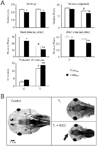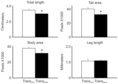 Figure 1. Comparison of morphological characteristics of ING2-overexpressing tadpoles (TransING2, filled bars; n = 19) and transgenic tadpoles expressing GFP only (TransGFP, empty bars; n = 10).The asterisk denotes a significant difference between the two groups (ANOVA, p<0.001; body area: Mann Whitney U, p = 0.005). The error bars represent the standard error of the mean.