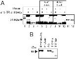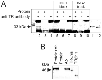 Figure 6. Evidence that ING proteins are present in TR-containing complexes.A) Endogenous p33ING protein coimmunoprecipitates with TRs in tadpoletail homogenates. Immunoprecipitations with a mouse polyclonal anti-TR antibody were carried out on X. laevis total tail homogenates from metamorphic climaxNF stage 60â62 tadpoles (where ING, TH, and TR levels are all high), followed by immunoblots with a mouse monoclonal anti-ING antibody. A weak, but highly reproducible, specific 33 kDa band (indicated by an arrow) was detected (lane 2) when Sepharose beads were coincubated with anti-TR antibody and tail homogenate (Protein) and not present when either was incubated alone with the beads (lanes 3â4). Lane 1, protein homogenate (30 µg). This band is also not visible in Western blots where the anti-ING antibody was preincubated with either purified, bacterially-expressed p33ING1 (ING1 block; lanes 5â7) or p33ING2 (ING2 block; lanes 8â10). Lanes 11 and 12 are bacterially-expressed His-tagged Xenopus p33ING1 and p33ING2 proteins, respectively. Neither of the two slower migrating ING isoforms in lane 1 (see [49]) was immunoprecipitated. The strong upper and lower bands observed in lanes 2-10 are light and heavy chain immunoglobulins. B) Immunoblots of the same samples as above using another anti-TR antibody to demonstrate that TRs are immunoprecipitated. The 9B2 anti-TR antibody identified a band at â¼46 kDa that comigrates with bacterially-expressed frog TRα-His protein. The results shown represent one of three experiments with similar results.