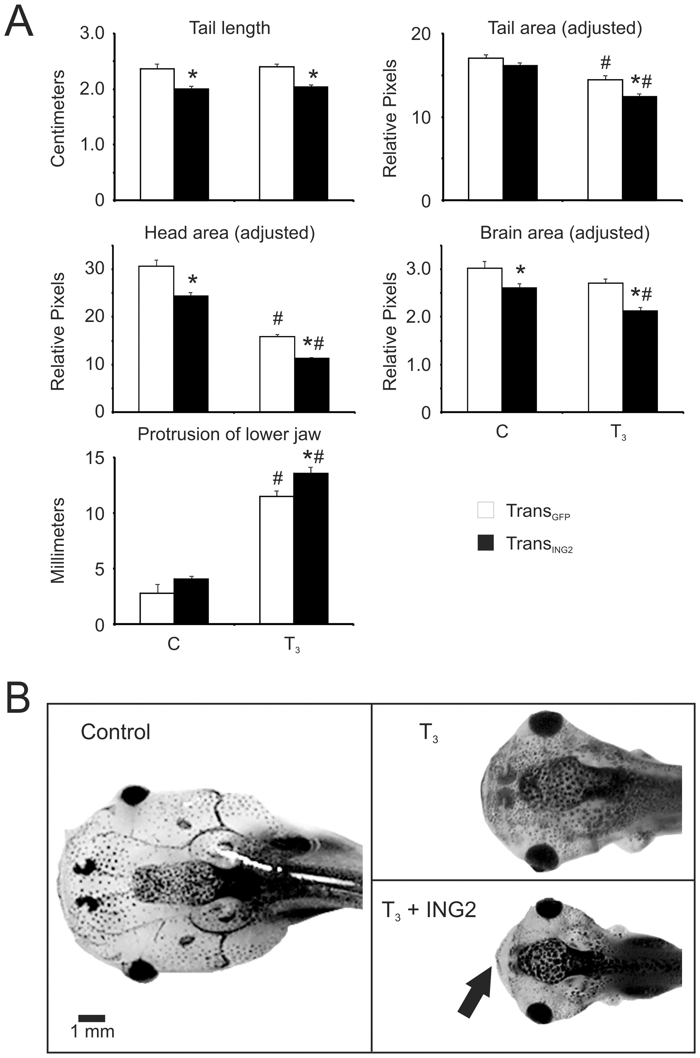 A) Comparison of morphological responses to T3 exposures of ING2-overexpressing tadpoles (TransING2, black bars; n = 20) and transgenic tadpoles expressing GFP only (TransGFP, white bars; n = 10). Vehicle control animals (C) are compared with tadpoles treated with 10 nM T3 for 5 days (T3). The asterisk denotes a significant difference between the TransING2 and the TransGFP transgenic animals (ANOVA, p<0.04; brain area: Mann Whitney U, p = 0.033). The �#� indicates statistical significance relative to the vehicle control within a transgenic type. The error bars represent the standard error of the mean. �Adjusted� data were corrected for the differences in body sizes by dividing the area values by the tail lengths before analysis of T3-dependent effects. B) Dorsal view of representative X. laevis tadpoles that were exposed to vehicle control (�C�) or T3 for 5 days. The black arrow indicates a more prominent protrusion of the lower jaw in the TransING2 animals compared to TransGFP transgenic animals.