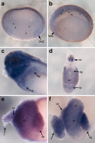 Key: endomesoderm, arrowheads; dorsal marginal zone =DMZ.