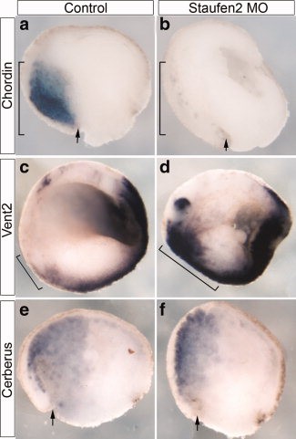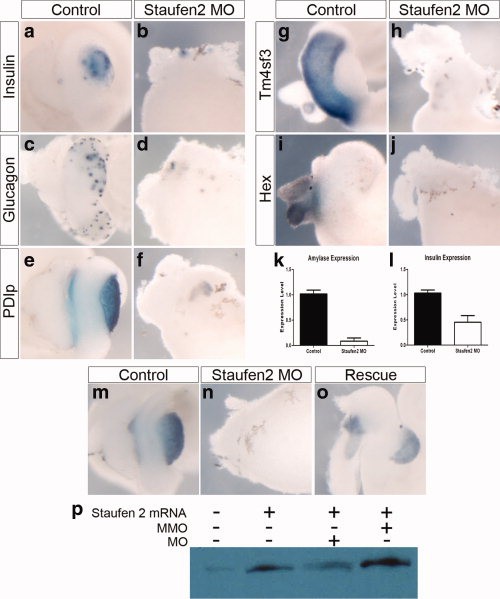 Figure 3. Staufen2 is required for the patterning of the developing anteriorendoderm. a,b:Pdx1 expression by whole mount in situ hybridization in control and Staufen2-MO-injected embryos at NF35, expression of pdx1 is lost in the developing stomach and pancreatic anlagen (83%, n = 12). c,d: NF35 embryo, expression of ptf1a is almost completely lost in the developing dorsal and ventral pancreatic bud (80%, n = 10).