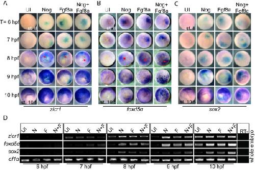 Figure 2. BMP inhibition and FGF signaling prematurely induce the expression of early neural genes. (A-C) WISH for zicr1, foxd5α and sox2 of embryos injected with mRNA coding for Nog, FGF8a or Nog + FGF8a and lacZ mRNA (cyan) and collected at stage 8 (t = 6 hpf) and each subsequent hour after until stage 10.5 (t = 10 hpf) when cultured at room temperature. Red arrows indicate earliest onset of expression. All images are animal pole view with dorsal to the top. (D) RT-PCR of whole embryos dissected from uninjected embryos (UI) or embryos injected with Nog, FGF8a or Nog+FGF8a. Embryos were collected as in A-C. Genes analysed are indicated on left side, treatment on top, time of collection below panel. ODC used for loading control. All images are animal pole view with dorsal to the top.