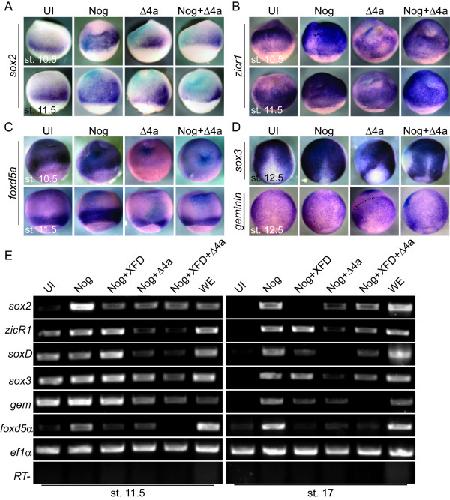 Figure 3. FGF signaling is required for the induction of sox2 and foxd5α expression in the neural plate and the maintenance of other early neural genes. WISH for (A) sox2, (B) zicr1, (C) foxd5α, and (D) sox3 and gem of embryos that were either uninjected (UI) or injected with Noggin (Nog), dominant negative FGFR4a (Δ4a), or Nog + Δ4a and were collected at stages 10.5 and 11.5 (A-C) or 12.5 (D). All embryos are dorsal view with anterior to the top. The dashed line separates the domain of gem expression (right) from that inhibited by Δ4a (top left). (E) RT-PCR of ectodermal explants for genes indicated on the left side of panel. Explants were dissected from embryos that were either uninjected (UI) or injected with mRNA coding for Nog, Nog + dominant negative FGFR1 (XFD), Nog+delta4a, or Nog+XFD+delta4a.