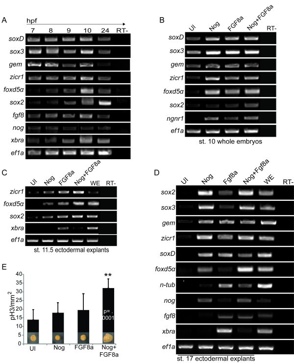 Figure 1. Temporal expression of early neural genes and response to Noggin and FGF8a. Semi-quantitative RT-PCR of early neural genes in embryos over time (A, B) or in ectodermal explants (C, D). Explants are from uninjected (UI) embryos or those injected with mRNA coding for Noggin (Nog), FGF8a, or Nog + FGF8a. Embryos in (A) were collected at the times indicated at top (hours post fertilization = hpf) and explants were collected at stage 11.5 (C) or 17 (D). Ef1a expression is a loading control. Samples without MMLV RTase added were used as RT- controls (far right). (E) Immunohistochemistry for phosphorylated Histone H3 of ectodermal explants dissected from embryos injected with mRNA coding for Nog, FGF8a, or Nog+ FGF8a and cultured to stage 17. Explants injected with Nog+ FGF8a are up to 1.7 fold (cm) bigger than those from uninjected embryos. Graph is showing the number of cells marked with pH3 per mm2 expression in n = 10 explants. Nog+ FGF8a caps have 1.8 fold more pH3 per count area than uninjected explants (p=.0001). UI indicates explants that were dissected from uninjected embryos, WE is whole embryo.
