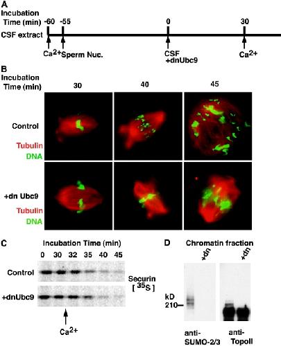 Figure 6. Perturbation of SUMO conjugation in mitosis causes chromosome segregation defects. (A) Schematic diagram of chromosome segregation assay. CSF extracts supplemented with rhodamine-labeled tubulin were released into interphase by CaCl2 addition. 2,000 sperm/μl were added 5 min after CaCl2, and the extract was incubated at 23°C for 55 min. Re-entry into mitosis was induced by addition of fresh CSF extract (50% of reaction volume) with or without dnUbc9 (150 ng/μl final concentration). After a 30 min incubation at 23°C, anaphase was induced with a second addition of CaCl2. (B) Aliquots were removed at the indicated times and analyzed for DNA morphology using Hoechst 33342 DNA dye (green) and for microtubule structures (red) after fixation. (C) The experiment was performed as above, with the addition of 35S-labeled securin at the time of the second aliquot of CSF extract. Samples at each time point were subjected to SDS-PAGE separation, and autoradiography using a Molecular Dynamics phosphorimager. (D) Mitotic chromatin were isolated from the reaction with or without dnUbc9 and subjected to Western blotting analysis with anti-SUMO2/3 and anti-topoisomerase II antibodies.