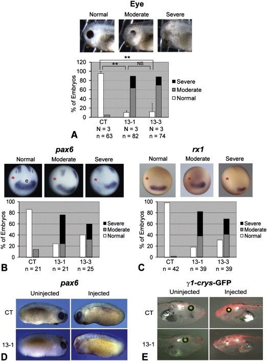 Fig. 1. Knockdown of ADAM13 affects eye development in Xenopus. Eight-cell stage embryos were injected in one dorsal-animal blastomere with the indicated MO (1.5 ng), and cultured to desired stages. (A) Embryos were scored at stage ~35 for eye defects. One example of each phenotype is shown in the upper panels, and results of multiple experiments are graphed in the lower panels. **, p < 0.001 for comparison between control (CT) and 13-1 morphants, and p = 0.002 for comparison between CT and 13-3 morphants; NS, not significant (p = 0.91). (B and C) Embryos were cultured to stage ~12.5, and in situ hybridization was carried out for pax6 (B) or rx1 (C). The injected side is denoted with a red asterisk. e, eye field; l, lateral stripes. (D and E) Wild-type (D) or γ1-crys/GFP3 transgenic (E) embryos were injected with MO CT (upper panels) or 13-1 (lower panels). Embryos were cultured to stages 21â24 and processed for in situ hybridization for pax6 (D), or to stage ~45 (E). Representative embryos were photographed on both the uninjected (left panels) and injected (right panels) sides. Images taken in red (for co-injected red dextran) and green (for GFP) channels and bright field were merged in E. Note the lack of eye structures and GFP expression on the injected side of the 13-1 morphant. N = number of independent experiments; n = number of embryos scored (same below).