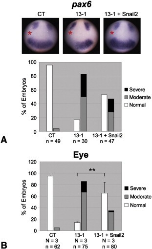 Fig. 4. Snail2 rescues the eye phenotypes caused by ADAM13 MO. One dorsal-animal blastomere of 8-cell stage embryos was injected with the indicated MO (1.5 ng) to- gether with or without Snail2 transcript (200 pg). Embryos were processed for in situ hybridization for pax6 at stage ~12.5 (A), or scored for eye defects at stage ~35 (B). The injected side is denoted with a red asterisk. See Fig. 1A and Materials and methods for phenotype scoring. **, p=0.008.